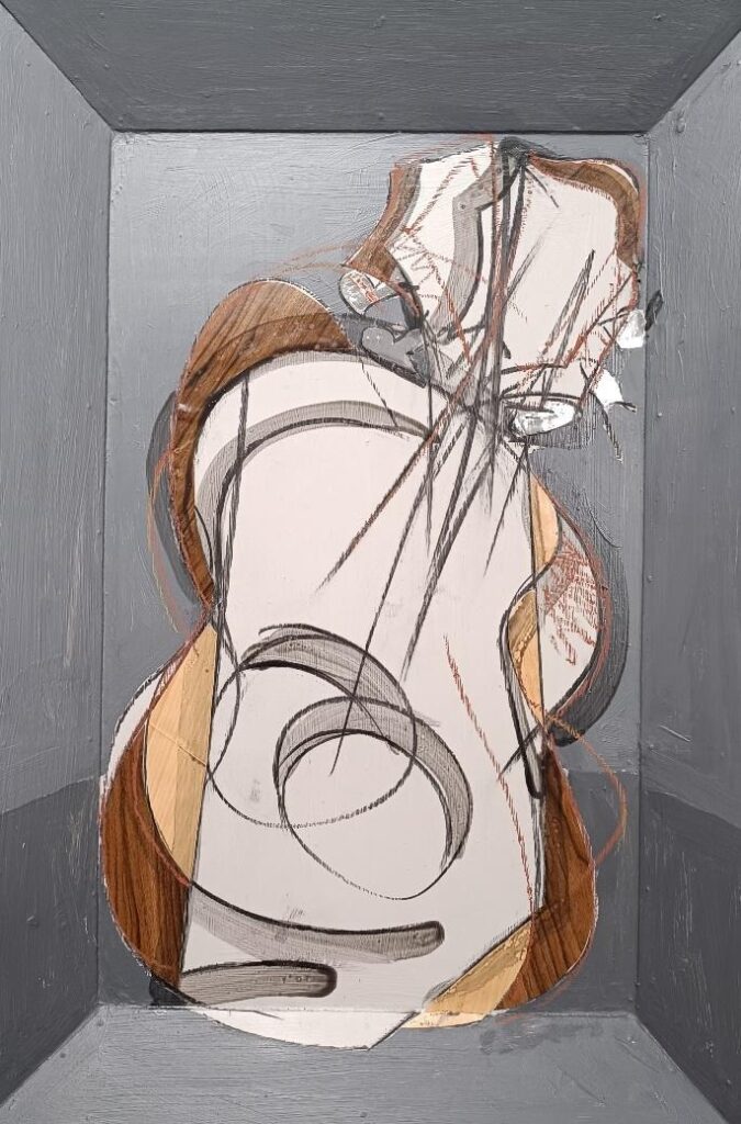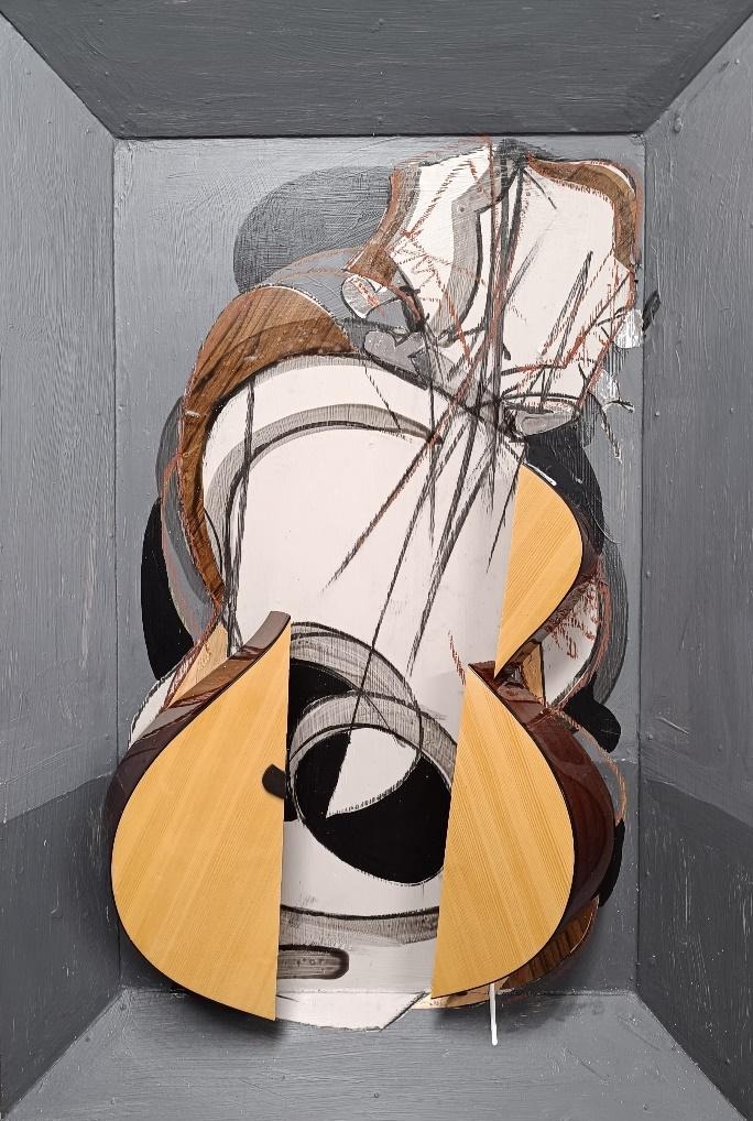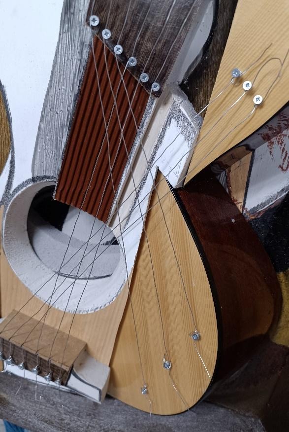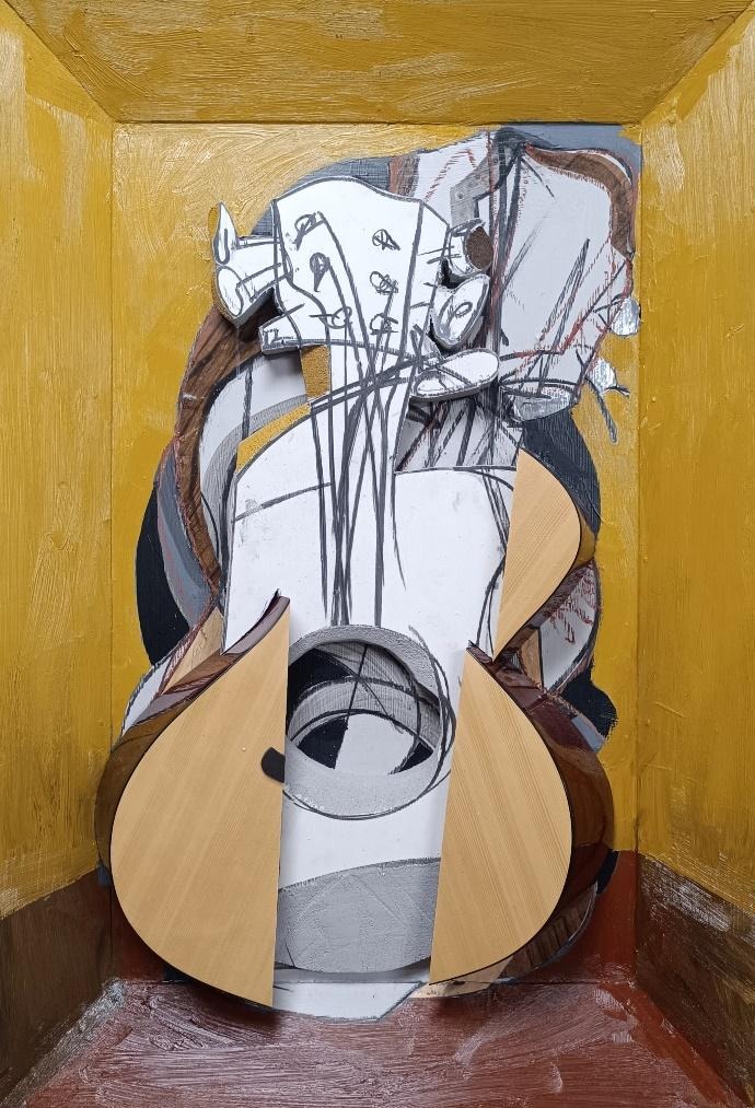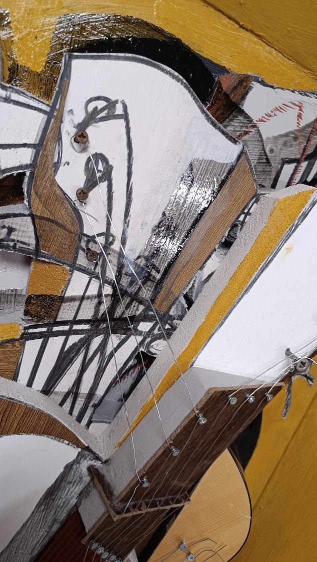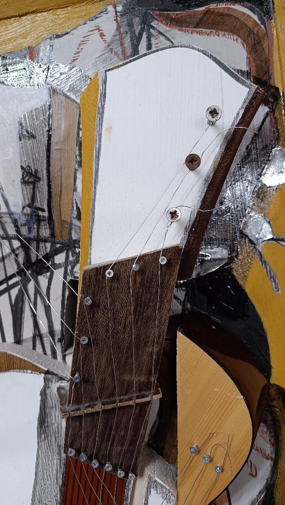 Ennen kerroksia pohjaan lisätään konkreettisia paloja oikeasta kitarasta, joka on toiminut alkujaan mallina itse luonnokselle. Kitara, josta havainto on luonnosteltu ja piirretty, muodostuu osaksi teosta. Tämä tuo konkreettisen kolmannen ulottuvuuden informaation ja vuorovaikutuksen osaksi teosta. Teos on samaan aikaan havainto ja kokemus itse maalattavasta kohteesta, mutta myös maalattava kohde itse, purettuna ja uudelleenrakennettuna.