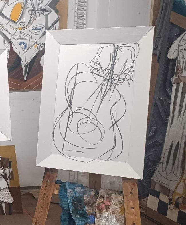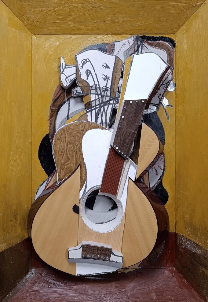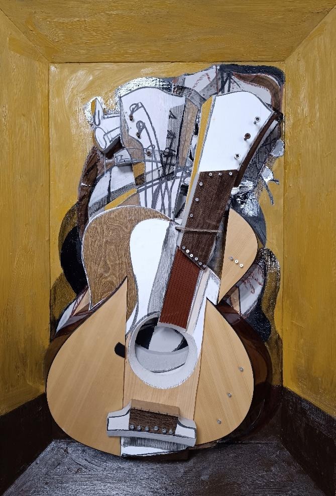 Jo alusta alkaen kitara pyritään ilmentämään sen tunnistettavien elementtien kautta. Kollaasien asettelu, erilaiset kollaasimateriaalit sekä luonnoksen viiva muodostavat kitaran olemuksen. Kolmiulotteinen pohja toimii teoksen pohjana konkreettisesti, mutta myös filosofisesti. Lopullinen teos rakentuu pohjaan luonnostellun kitaran mukaisesti ja sen ohjaamana. Tällöin Hyperkubismin filosofia viidennen ulottuvuuden tietoisuudesta saa visuaalisen raaminsa. Kuten elämässä tietoisuus on kokemuksen ja todellisuuden perusta, hyperkubistisessa teoksessa pohja on kokonaisuuden perusta.